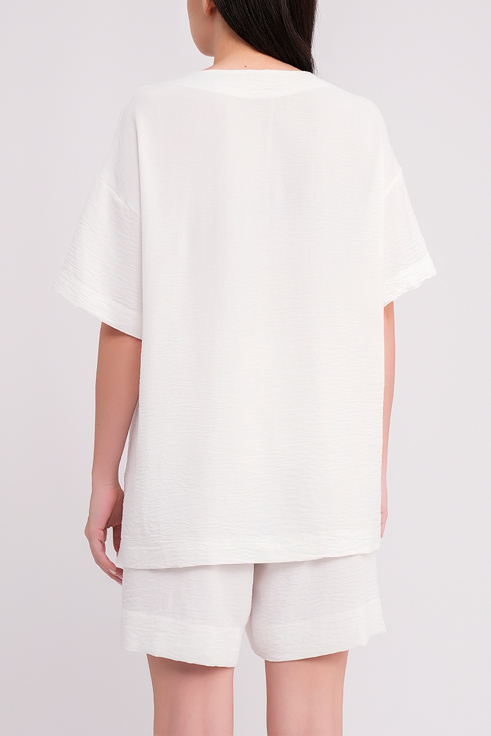 Блузка имеет свободный крой, V-образный вырез и застёжку на пуговицах по всей длине, что придаёт образу лёгкости и позволяет носить её как самостоятельный элемент или как лёгкую накидку. Спущенная линия плеч обеспечивает более расслабленную и комфортную посадку.
