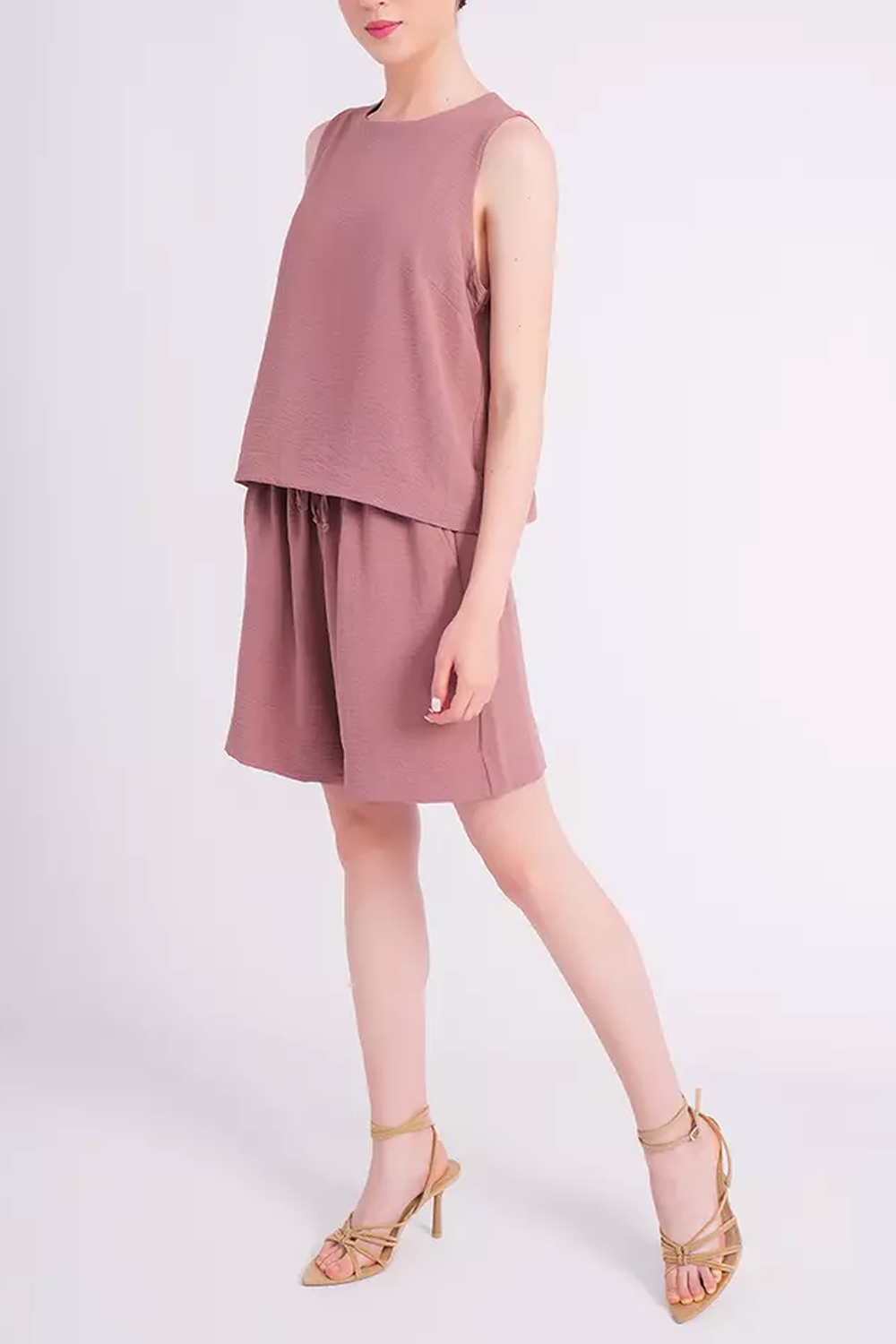 Модель состоит из топа и шортов, выполненных из американского крепа-жатки (лён) — лёгкой дышащей ткани, которая дарит ощущение свежести и комфорта даже в жаркую погоду.