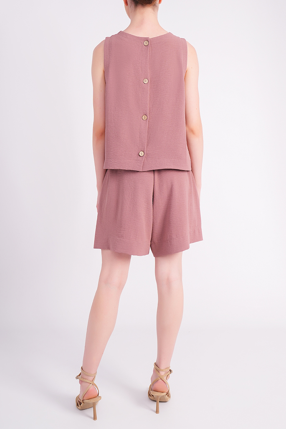 Топ имеет свободный крой и аккуратный круглый вырез горловины. Модель без рукавов выглядит легко и непринуждённо, а застёжка на пуговицах на спине выступает стильным акцентом.