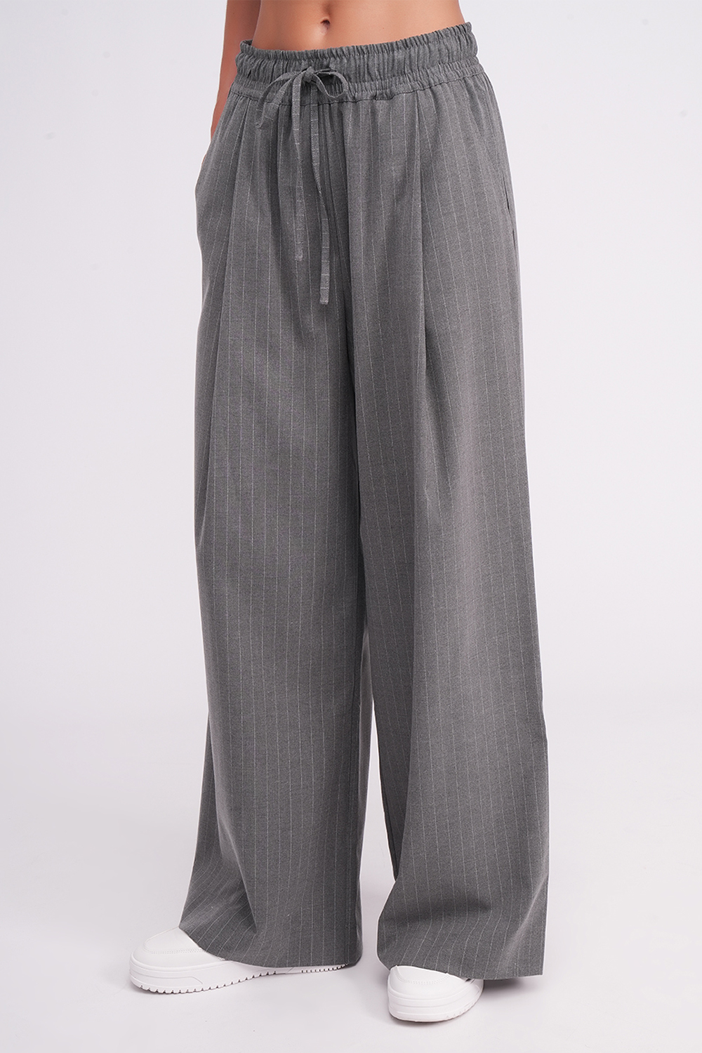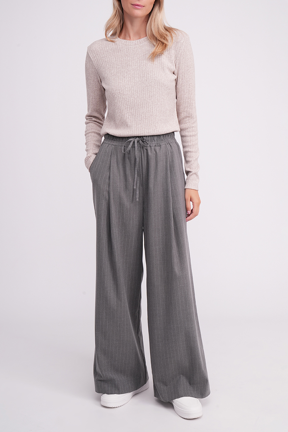 Высокая посадка в сочетании с широким эластичным поясом и завязками обеспечивает удобную фиксацию и аккуратно подчёркивает талию. Глубокие складки спереди добавляют образу элегантности и создают эффект более стройного силуэта.