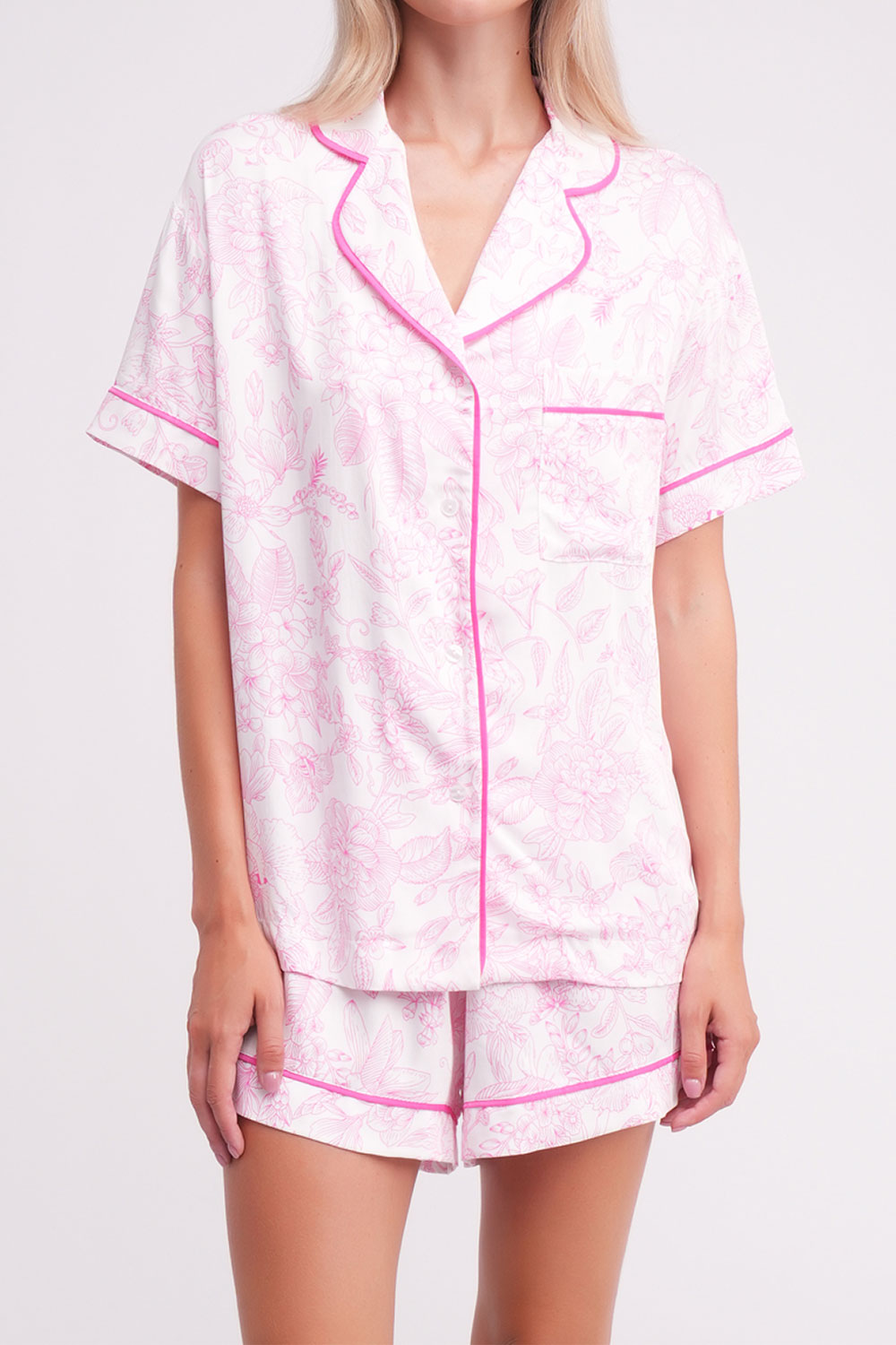 Комплект включает рубашку с короткими рукавами и шорты, украшенные изящным цветочным принтом и аккуратной контрастной отделкой.