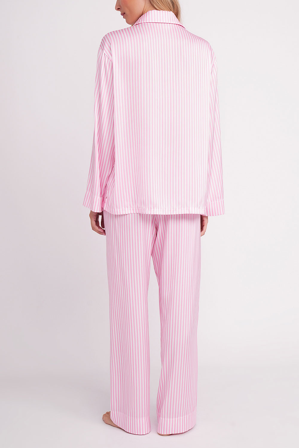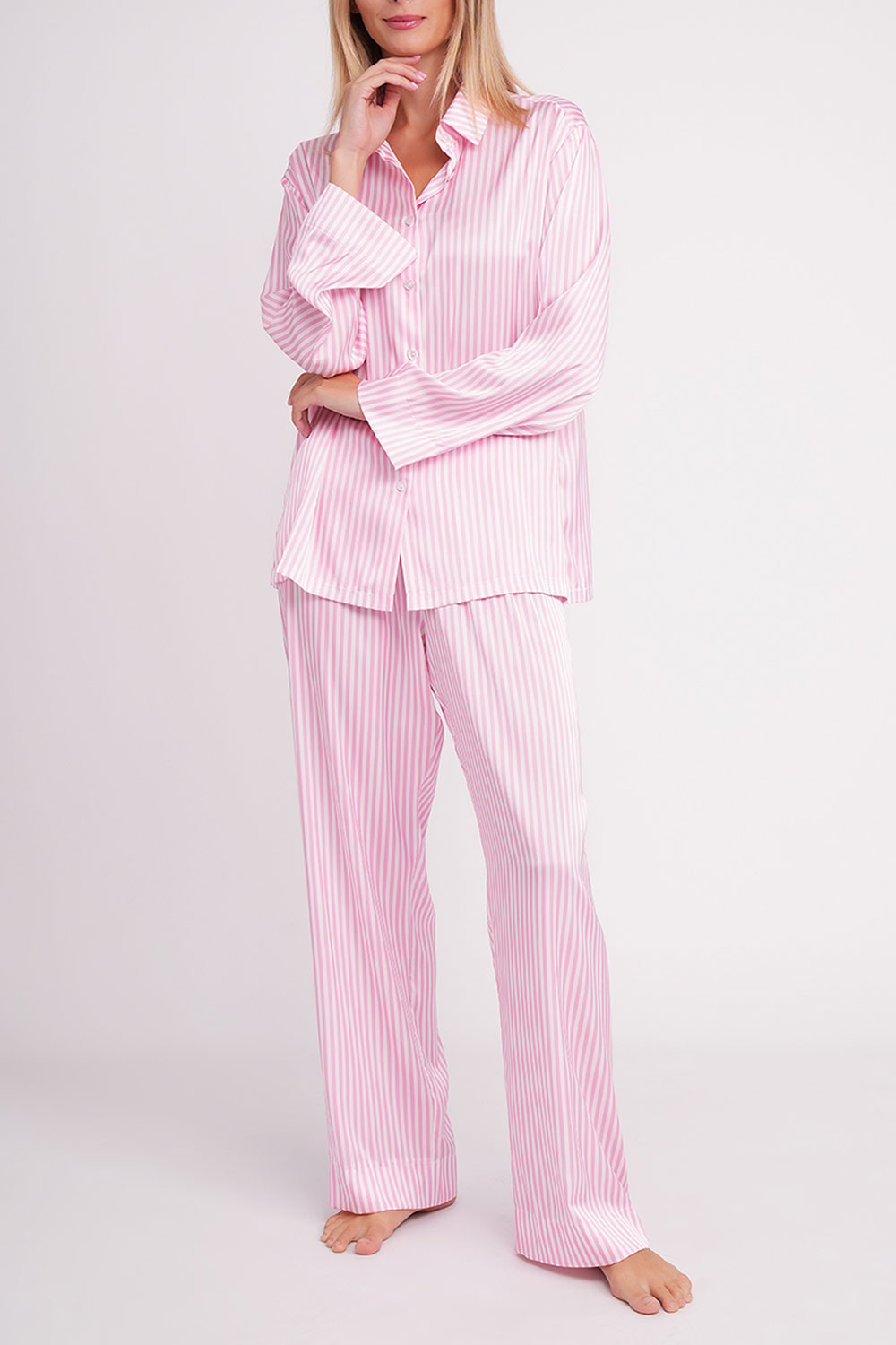 Пижама в полоску, что придаёт образу сдержанной элегантности и визуально вытягивает силуэт.