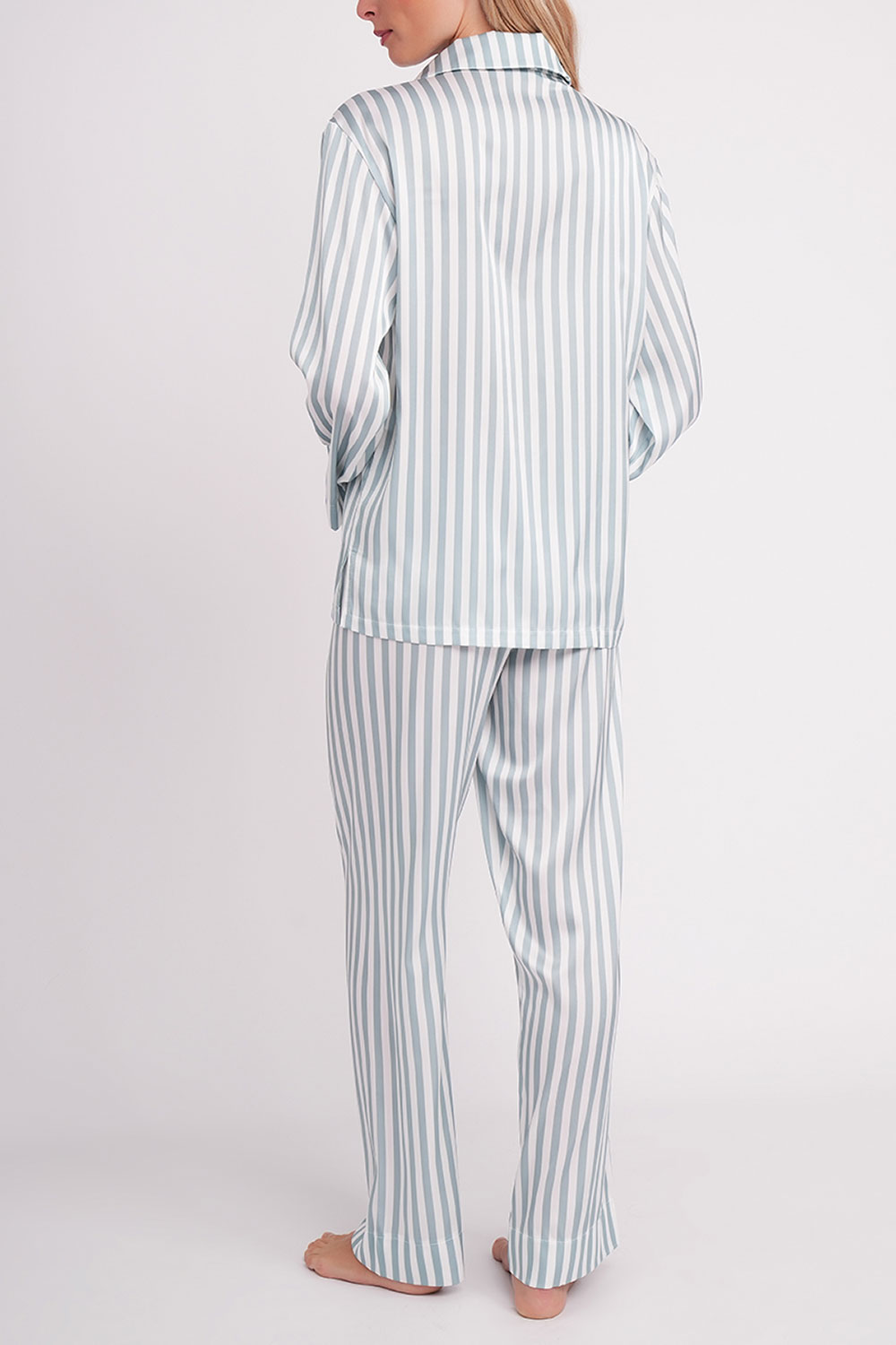 Пижама в полоску, что придаёт образу сдержанной элегантности и визуально вытягивает силуэт.