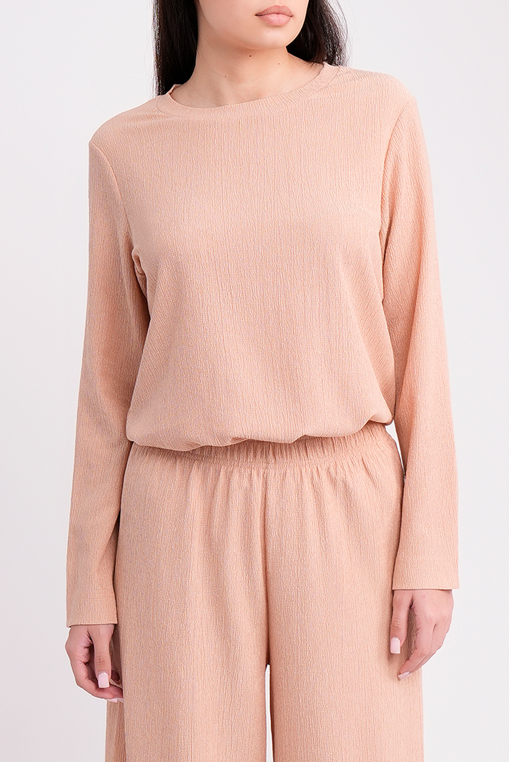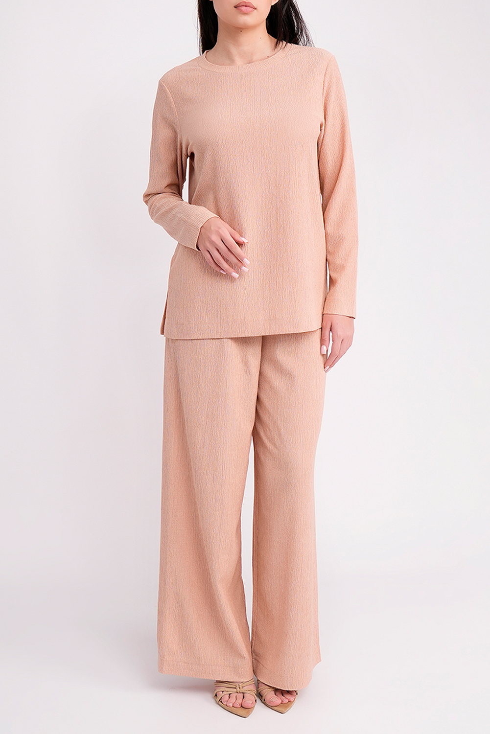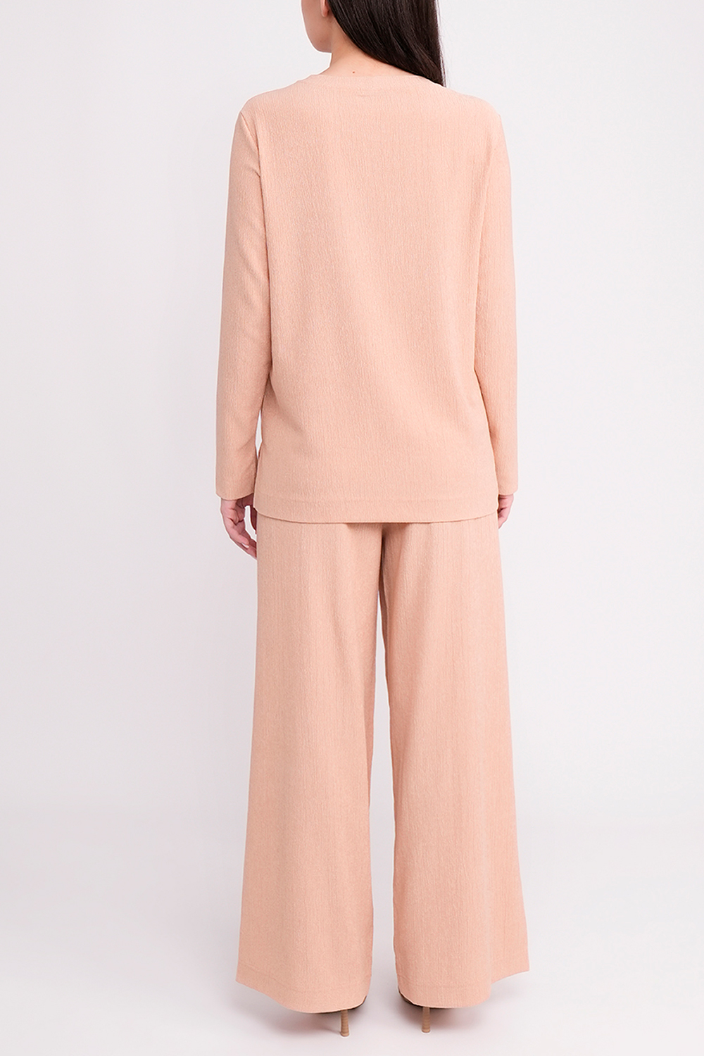 Комплект состоит из удлинённого лонгслива и широких брюк, которые вместе создают гармоничный и удобный повседневный образ.