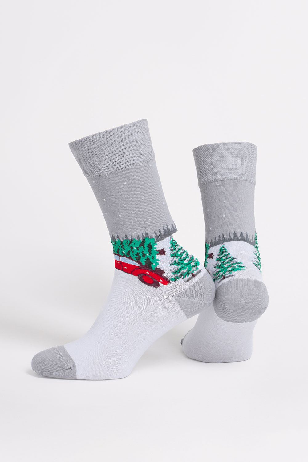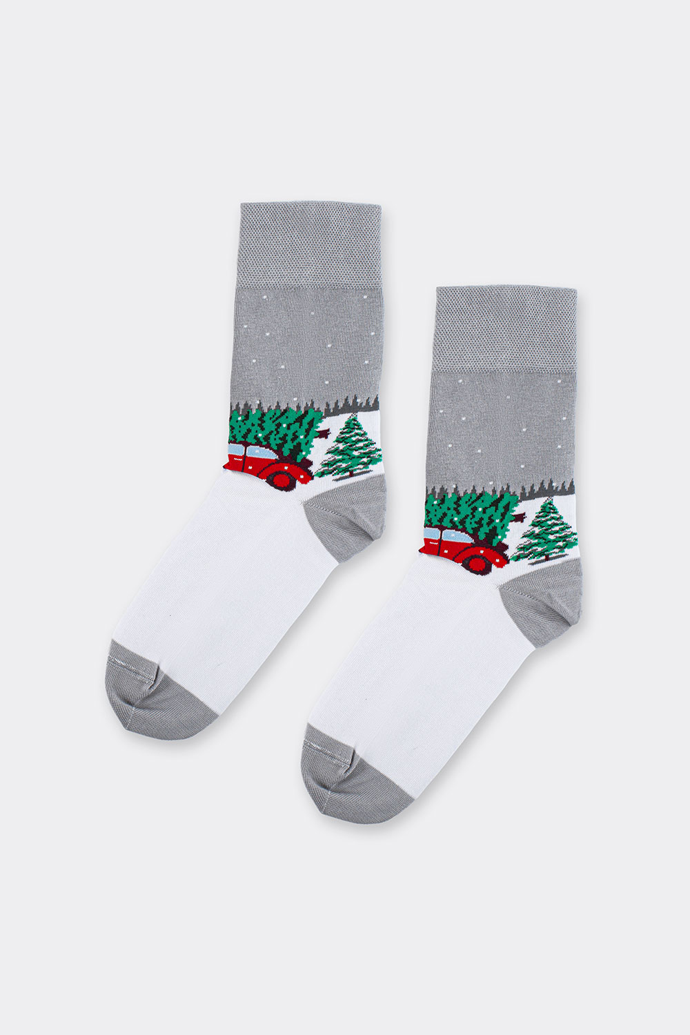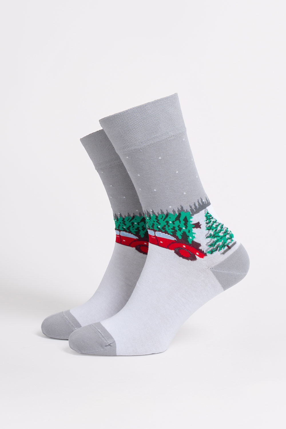 Чоловічі шкарпетки новорічні MS3 NEW YEAR 2602 із чарівним принтом червоної машинки, що везе ялинки.