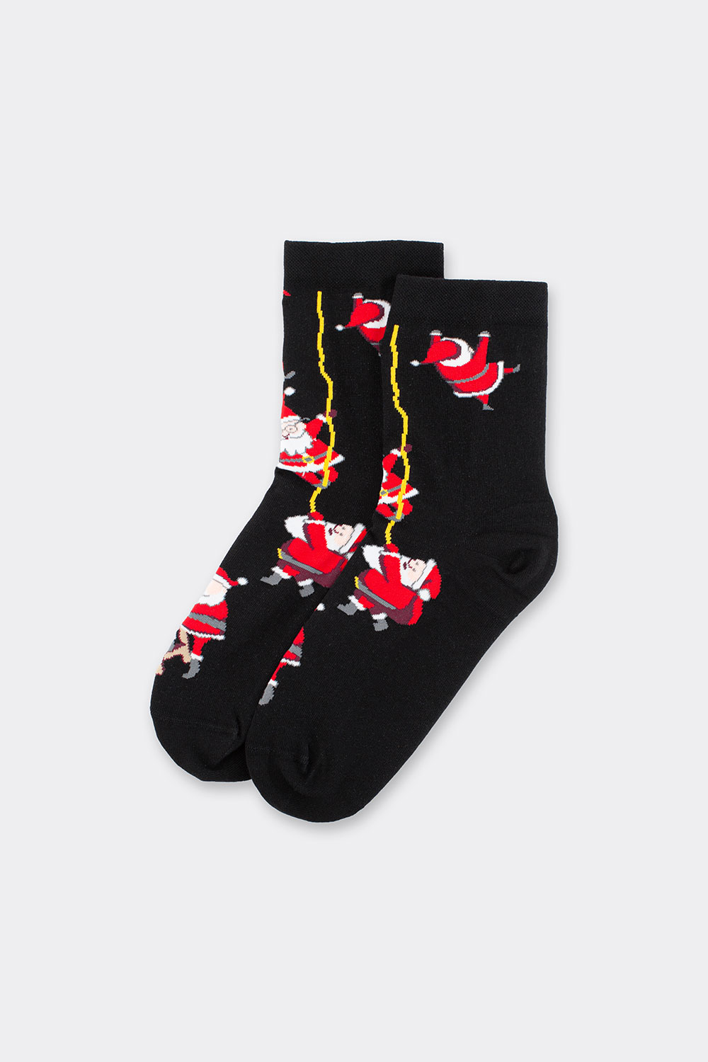 Жіночі новорічні шкарпетки WS3 NEW YEAR 2601 легко перетворять зимовий образ на по-справжньому святковий: грайливий принт із веселими Санта Клаусами додає настрою, а м’який бавовняний матеріал дарує комфорт і тепло.