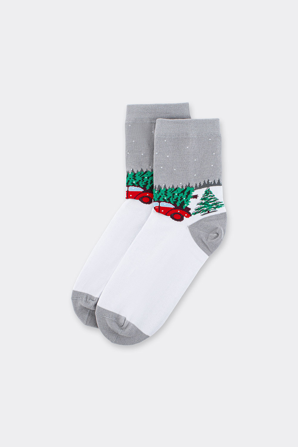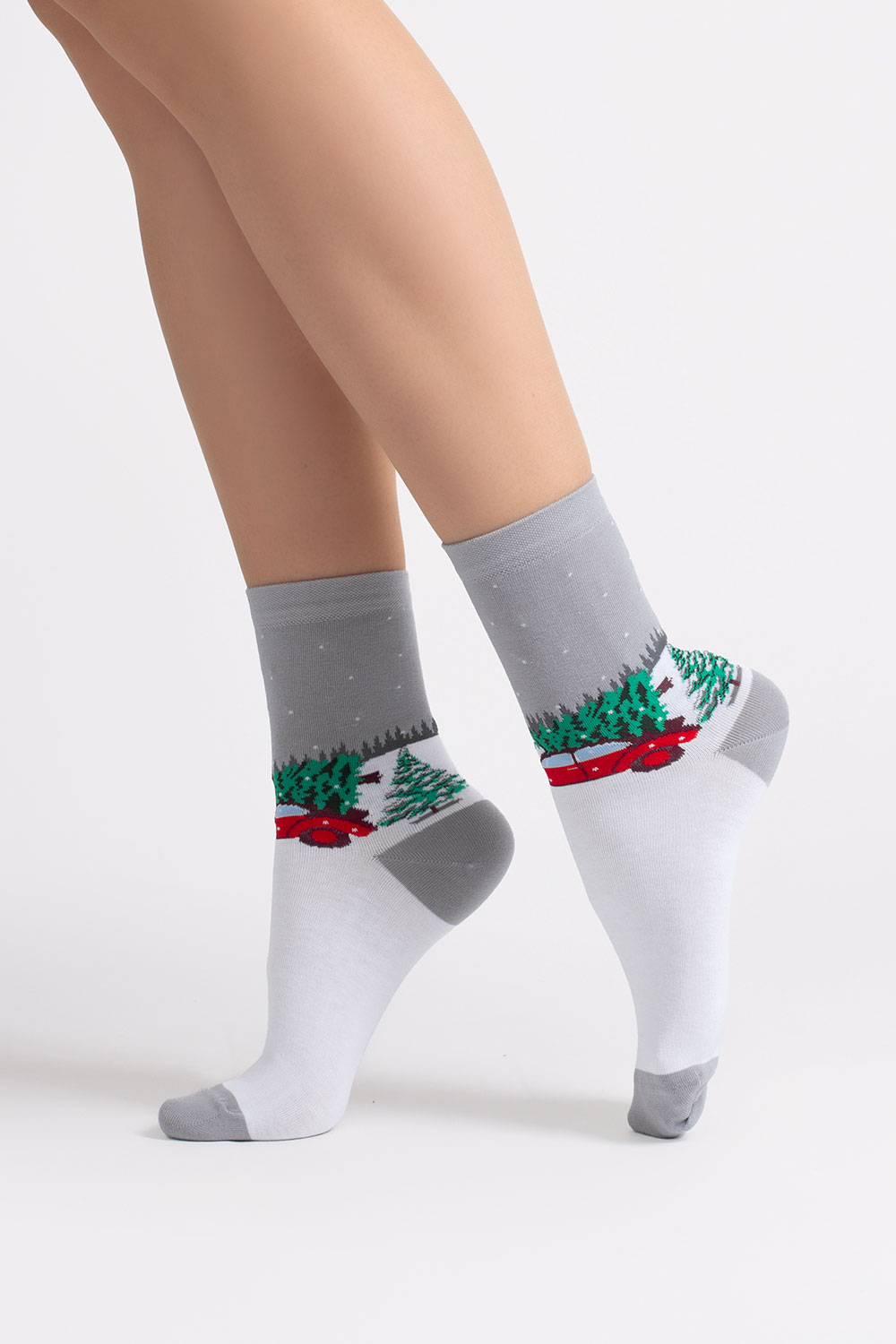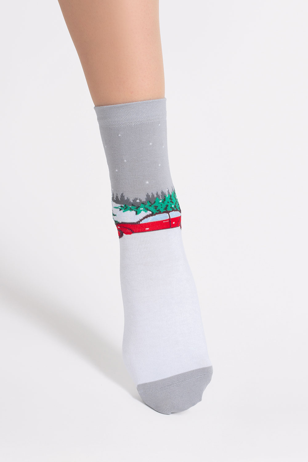 Жіночі новорічні шкарпетки WS3 NEW YEAR 2602 із чарівним принтом червоної машинки, що везе ялинки.