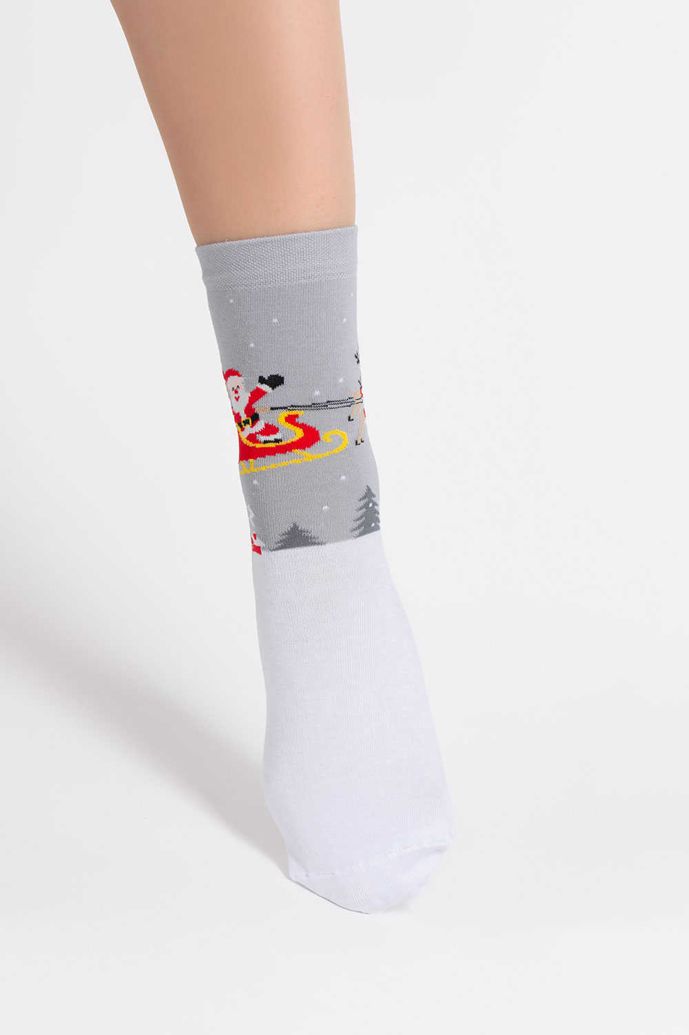 Жіночі різдвяні шкарпетки WS3 NEW YEAR 2606 стануть яскравим доповненням зимового образу: зі святковим мотивом Санти, який мчить у санях із оленями, та теплим написом Merry Christmas на стопі.